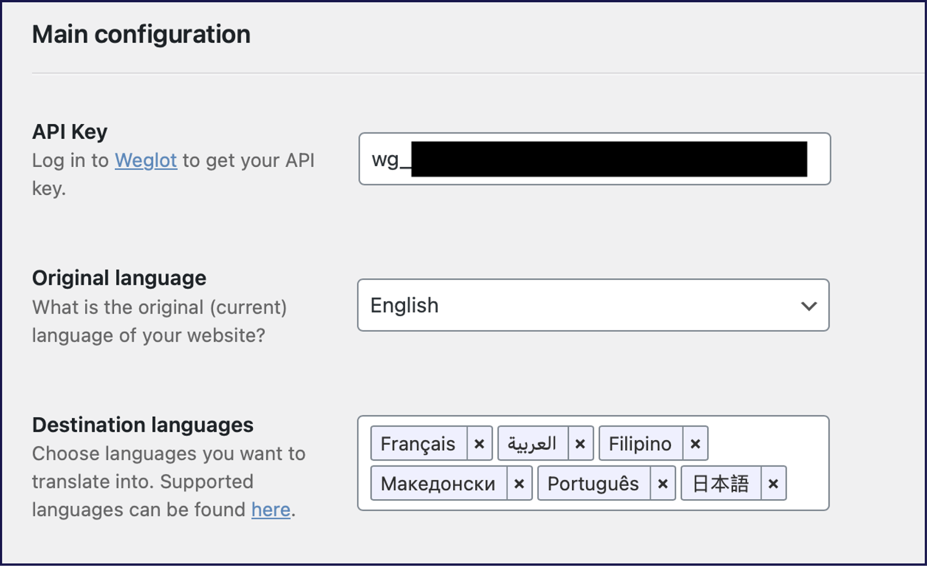 Install the Weglot plugin, connect your API key, and choose your target languages.