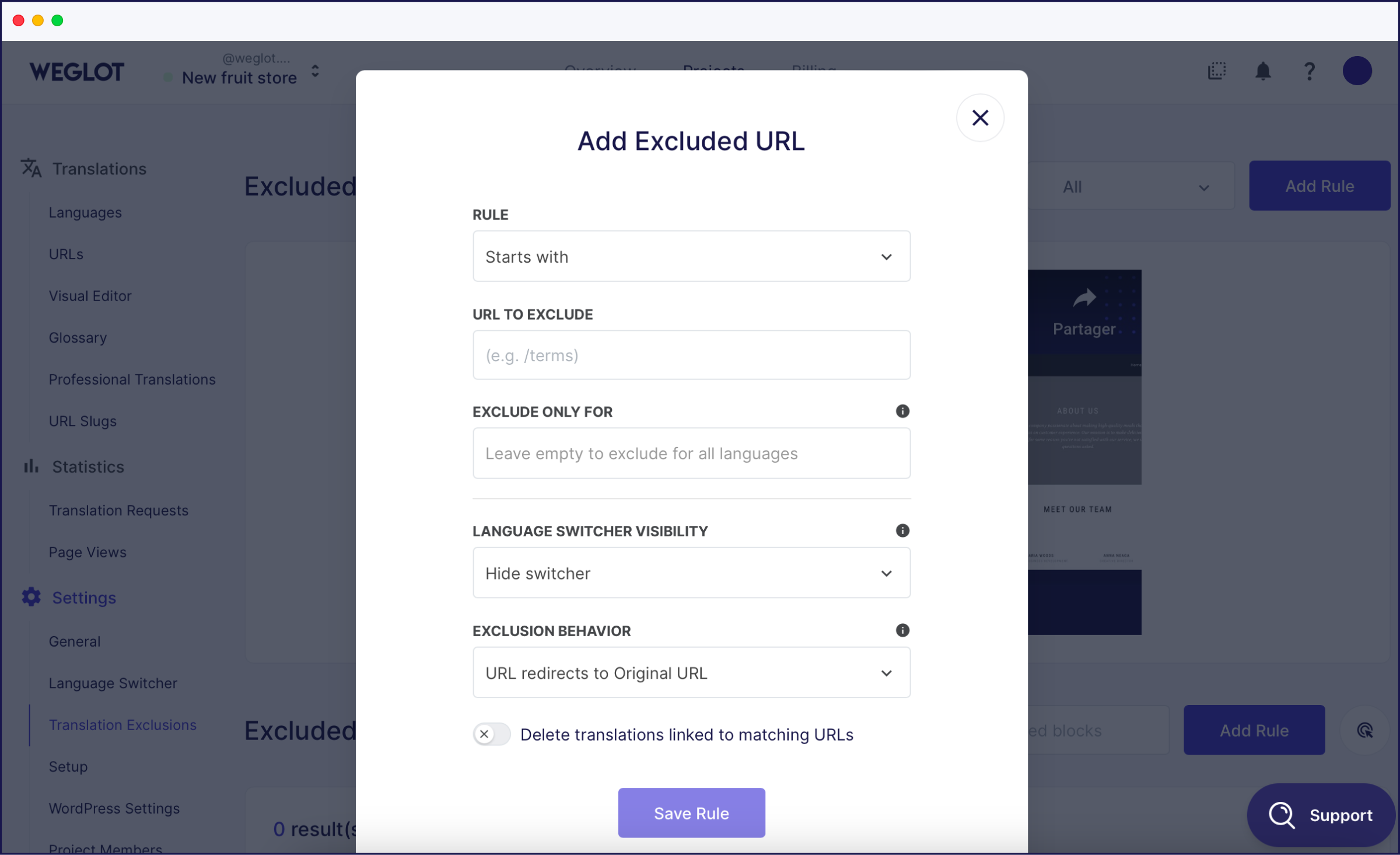 Besides the language button, you can also change other settings. The default setting of the Weglot plugin translates everything on the webpage. However, if you want certain parts to not be translated, you can exclude that content by going to the Translation Exclusion tab.