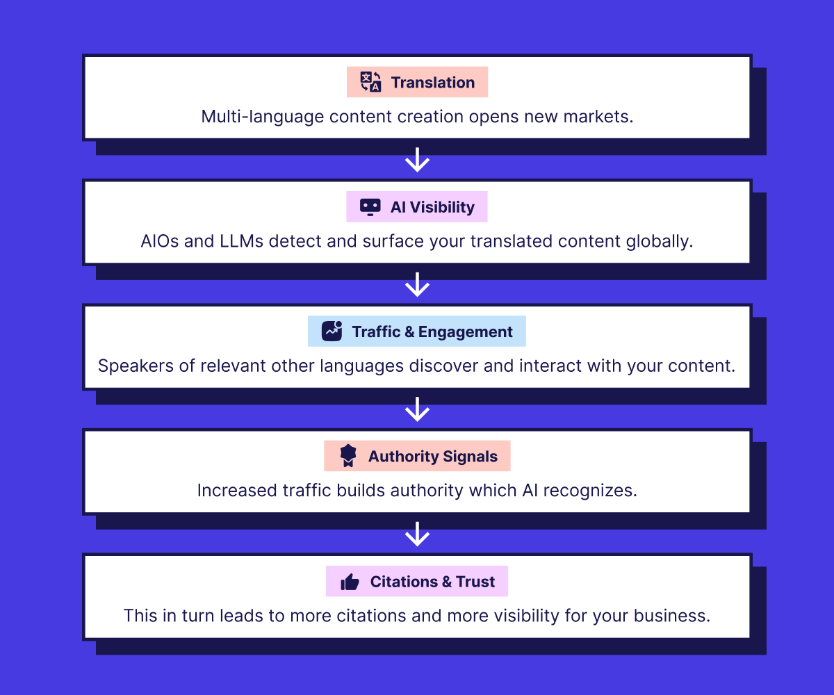 Onze bevindingen suggereren dat vertaling autoriteit en betrouwbaarheid uitstraalt naar AIO's en ChatGPT, waardoor de citatieprestaties in alle talen verbeteren, niet alleen in de taal waarnaar ze vertaald zijn.